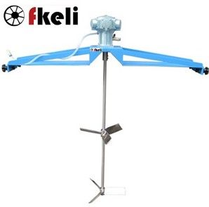 此机型以坚固U型槽钢构成,适用于任何流体槽、桶类,装有四个万象轮,使搅拌机可以轻便移动。其中一组附有刹车,使搅拌机搅拌时安稳固定,并以气缸控制升降高度,升高后离地1100mm。