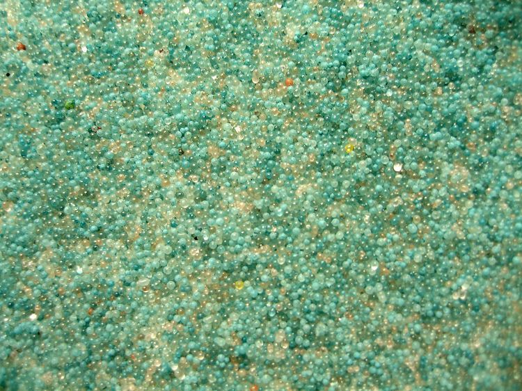 将普通的石英砂加入陶瓷颜料和特殊的助溶剂,使用专门的彩色陶瓷烧制技术经过高温烧制而成。