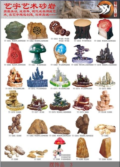 主营业务:仿砂岩雕塑喷泉、花盆、柱子装饰、艺术灯饰、壁炉镜框、浮雕壁画、挂件装饰、拼砖装饰、玻璃钢工艺摆件、线条装饰