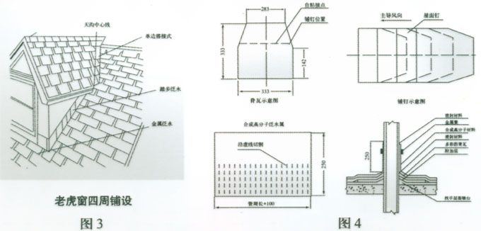 对于设有老虎窗的坡屋面,老虎窗屋面与主屋面交接缝可采用单边搭接天沟方法铺设;老虎窗四周墙面与主屋面交接处可用前述的踏步泛水和女儿墙泛水方法铺设。(见图3)