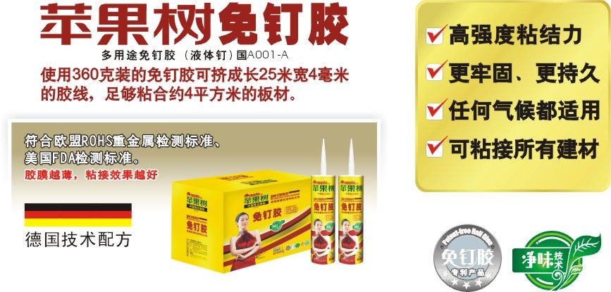 苹果树免钉胶,采用了先进的 “IPS+(新型聚合体合成工艺)”技术,大幅度降低产