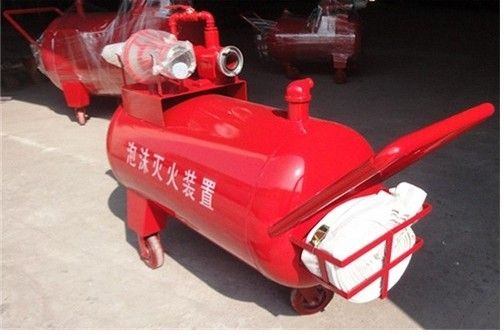 移动式泡沫罐(泡沫比例混合器),推车、常压泡沫罐、负压比例混合器、泡沫喷射设备、水龙带、安全阀、控制阀门及一些辅助零部件等组成。容积50-500L,流量4-8(L/S)