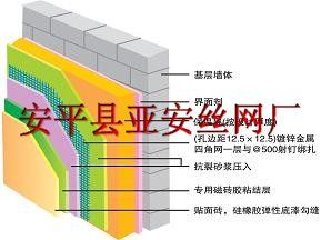 墙体保温网的施工程序:基层墙体处理→涂刷*界面沙浆→吊垂直、套方、弹控制线→用保温浆料作灰饼、作冲筋、作口→加金属分层条、钉带尾孔射钉,穿镀锌铅丝→抹保温浆料2厘米→用镀锌铅丝绑钢丝网压入保温浆料表面→24小时后抹2厘米保温浆料找平→划分格线、开分格槽、门、窗口、滴水槽→抹抗裂沙浆→铺压玻纤网格布→抹第二遍抗裂沙浆→压入第二层玻纤网格布→涂刷防水弹性底层涂料→刮柔性耐水腻子→外墙涂料施工→保温施工整体验收。 - 安平县亚安丝网厂