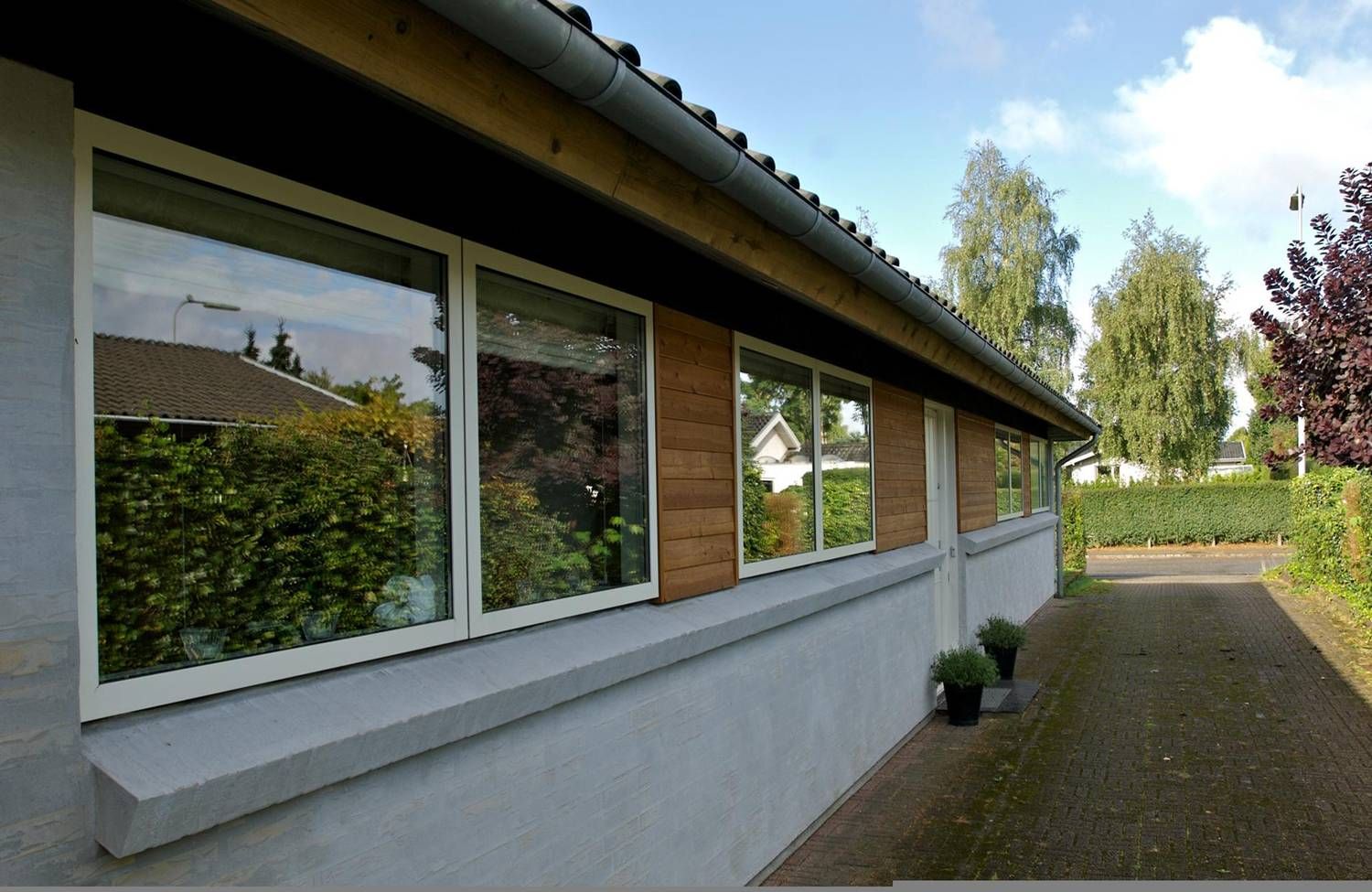 ①、木铝组合,框为实木(集成木),扇为铝合金,二者通过合二为一重叠设计,增加窗户的透光面积。