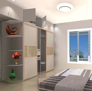 卡莱雅整体衣柜主要分趟门和柜身两大部分,一般柜身有侧板、层板、抽屉、上下顶底板、地脚线、背板、顶柜、配件及边接件组成。(门板为9mm、背板为9mm和5mm两种、柜身其余板件为18mm)侧板靠墙时多采用600mm深的深侧板,而且一般保证安装效果都留有收口板。当无门设计时,衣柜侧板为490mm,(衣帽间结构加顶柜)。材质:柜身材料采用优质环保双饰面中纤板(附签定书),纹理为市面上少见的浮雕木纹系列。具有良好手感且不宜刮花;色泽主要选用素淡雅致的枫木 ,樱桃木及白松木色系,以及端庄厚重的黑胡桃、红檀木等。整块板材采用原色封边,过度自然,浑然一体。