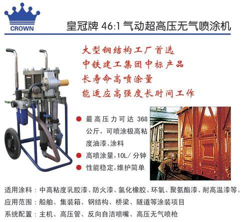 主要特点及适用范围: 高压力,适合远距离喷涂,适应面广。 高粘度厚膜型重防腐蚀涂料及各种常规涂料的喷涂。..