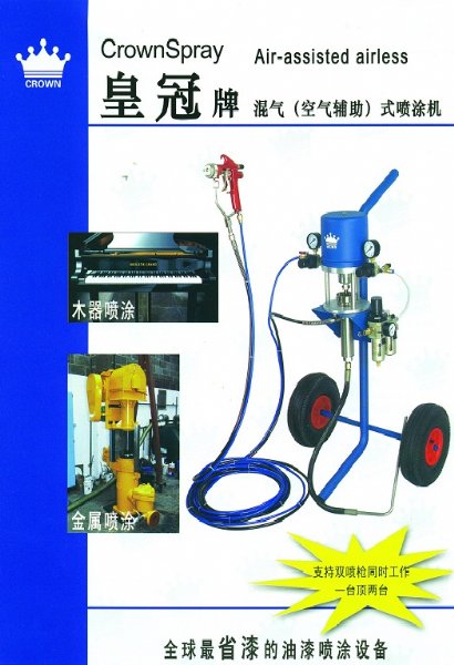 皇冠牌混气喷涂(空气辅助)式油漆喷涂机 水性漆喷涂机,水性木器漆喷涂机,在能够充分保证漆膜质量的前提下,为用户节省25%以上的油漆,广泛用于木器、金属和塑料喷涂。它油漆反弹飞散非常少,从而达到漆膜质量好和节省油漆的双重作用。