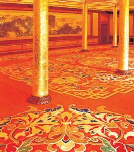 手工纯毛地毯 我国的纯毛地毯是以土种绵羊毛为原料,其纤维长,拉力大,弹性好,有光泽,纤维稍粗而且有力,是世界上编织地毯的*好优 质原料。目前,有的厂家将我国的土种绵羊毛与进口(如新西兰等 国)毛纤维掺配使用,发挥进口羊毛纤维细、光泽亮等特点,取得了很好效果。纯毛地毯的重量约为1.6~2.6kg/平米,是高级客房、会堂、舞台等地面的高级装修材料。 近年来还生产了纯羊毛无纺织地毯,它是不用纺织或编织方法而制成的纯毛地毯。