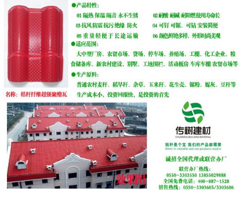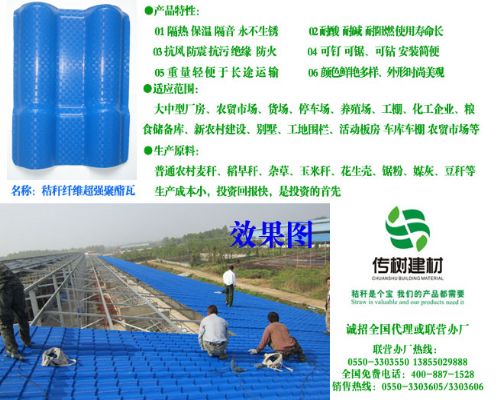 2.适用范围:大中型厂房、农贸市场、货场、停车场、养殖场、工棚、化工企业、粮食储备库、新农村建设、别墅、工地围栏、活动板房、钢结构工程、工地围栏、雨蓬、库房、楼堂馆所、长廊、景点仿古、平改坡、治污厂,基本上有顶的就可以用我们的秸秆瓦。