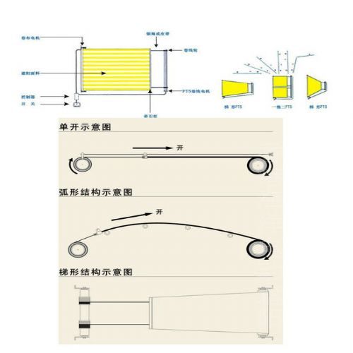 FTS双电机面料张力系统由传动系统(包括卷布管、卷绳管、导向系统、牵引系统、拖布杆等)、动力系统(包括卷布电机、卷绳电机)、安装系统、面料以及控制系统等五部分组成。