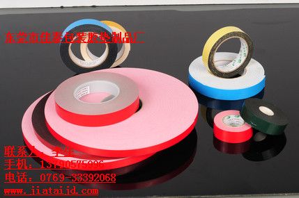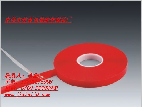 特点:高强度双面胶带具有抗反弹、翘曲、耐热、耐温性佳,同时还具有较强的粘接力和持粘力,对多种基材有较佳之粘合力,尤其适合弧面粘贴。适用于冲压型、铭板、薄膜开关的粘贴 - 东莞市佳泰包装胶垫制品厂