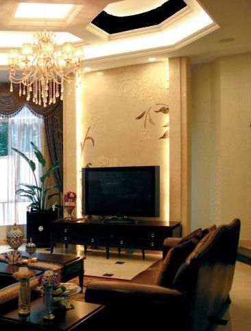 现代简约电视背景墙,平面效果更容易安装清洁,成本是石材背景墙中最为实惠的,2边再加上金属条或者格栅木饰面..