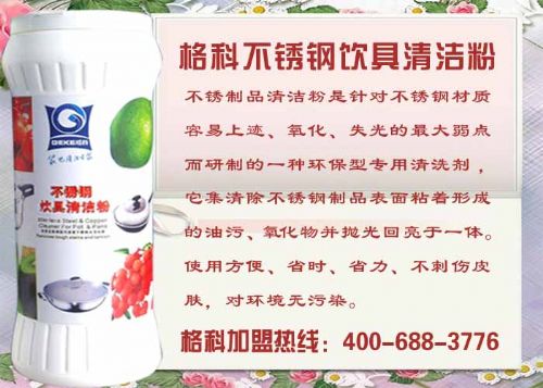 【使用原因】不锈钢用具、用品因使用时间长而上迹、黄斑或失光,只要使用格科牌不锈钢清洁粉轻轻一擦,黑迹清除光亮回复,无需再抛光。不锈钢清洁粉全面呵护你的不锈钢制品,天天清洁光亮如新,你一定会惊喜它神奇的效果!