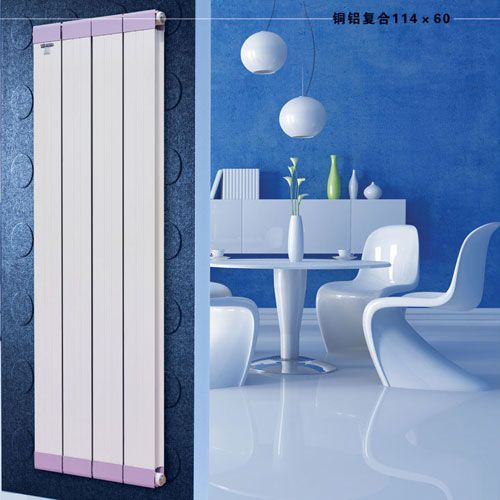 铜铝复合系列散热器采用当代先进的铜铝复合液胀技术,能使铜管和铝材内孔紧密结合,牢固,采用辐射加对流的传热导原理,散热量高,金属热强度是铸铁散热器的近10倍,是钢制散热器的近2倍,适合不同水质。内腔采用紫铜管,紫铜本身本身具有很强的耐腐蚀性能,通过特殊工艺使其高于任何形式的内防腐,色彩丰富,细腻光滑,总体造型新颖美观,采暖舒适,人性化设计。满足中高档家庭使用需求。同时,散热器可以根据消费者的特殊要求和实际情况进行设计生产。