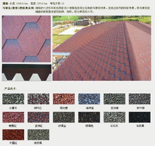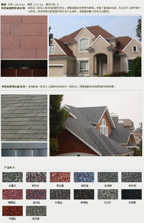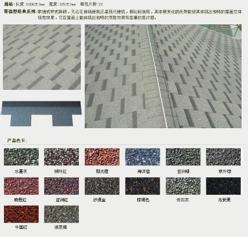 幻彩系列:独特的落砂系统能使单片瓦片上体现三种颜色的相互跳跃变化,体现一种梦幻般的视觉效果,整体建筑效果更显立体感和高贵。 - 哈尔滨市泰阳禹防水材料有限公司