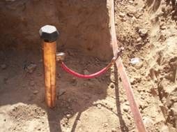 1、钻孔:在选好的施工场地开挖直径50cm×50cm垂直地面的圆坑,在坑里钻出直径12cm×300cm垂直地面的孔洞;2、配制填充料:可使用LD降阻剂或者离子缓释剂,将其和成稀泥状;3、将电解离子接地棒从包装中取出,检查产品是否完整。4、将配制好的稀泥状填充料填入孔洞底部;5、将接电解离子接地棒植入孔洞中,接地棒顶部与圆坑的底部平齐;6、接好引出线;引出线采用不小于35mm2的多股铜线或不小于40mm×4mm的镀锌扁钢,引出线与接地棒体实行压接,接点防腐处理;7、将其余填充料填在接地棒周围至接地棒顶端10cm时止,测量接地电阻,达到要求后,用土填盖在接地棒周围。 注:当一套接地棒达不到电阻要求时,可用二套或几套并联使用,棒与棒之间的间隔不宜小于5m,引出线采用35mm2多股铜线,引出线与接地棒实行压接,节点防腐处理。 - 青岛雷盾防雷科技有限公司