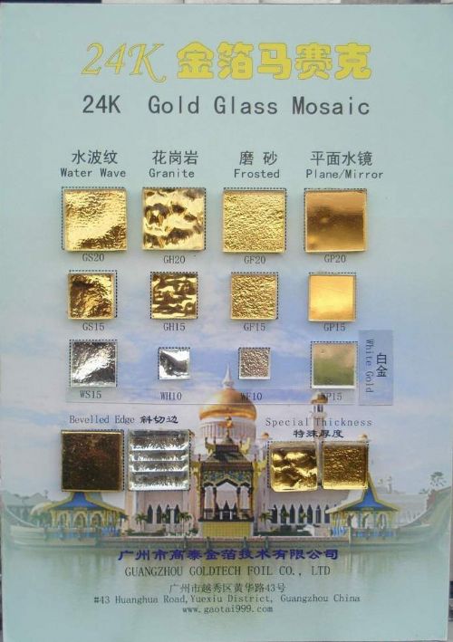 银玻璃马赛克——众所周知银是十分活泼的金属元素,用银做的产品由于极易在空气中氧化而变色,令许多厂家对做银玻璃马赛克望而却步,我公司生产的银玻璃马赛克,除兼备我公司自主产品金玻璃马赛克亮丽的视觉享受、“水刀”的切割效果和金层的附着强度高等三大优点外,由于银层经抗氧化处理而一举解决这个世纪难题,无论一般的银玻璃马赛克或夹层的银玻璃马赛克都不会变色,为金与银的搭配和做马赛克的拼图提供了更多的选择 - 广州市高泰金箔产品营销中心