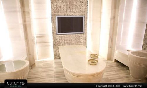 防水电视的安装可以挂在墙上,也可以在墙上挖个大小合适的壁凹,将电视的机身塞在墙里,这样是浴室看上去更加简洁了。安装前一定要预留好电视的电源线等。