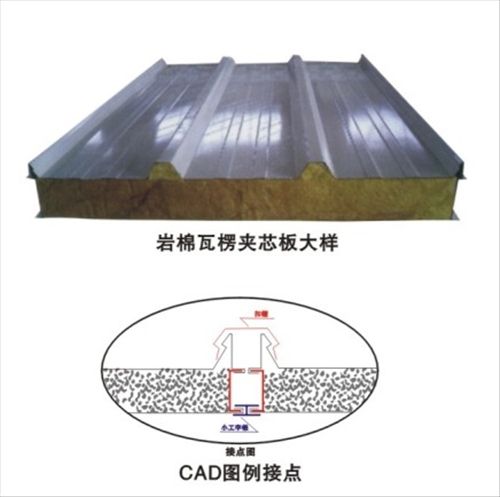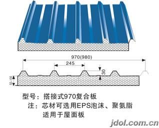 A、950瓦楞彩钢夹芯板 集瓦楞板及夹芯板于一体,比普通平面彩钢夹芯板强度增加了三倍,采用隐藏式自钻螺钉与屋架联接,不破坏彩涂板的外露部分,延长了彩钢夹芯板的寿命;板与板联接采用扣帽式,便于施工,提高功效,*大特点不易渗水。