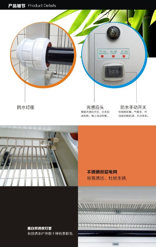 1.产品采用铝合金与不锈钢材料结构,不会锈蚀、耐用美观;杀虫范围超过一百平方米以上,使用时间长达10年以上。