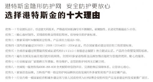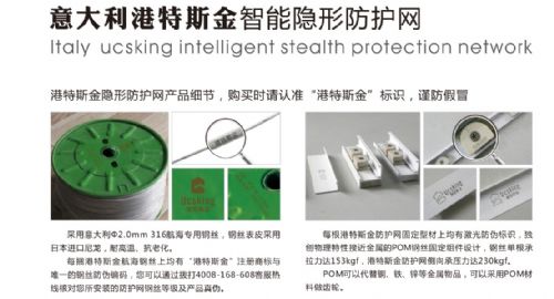 不是随便一根钢丝都能做成防护网,港特斯金专注隐形防护网,行业独家采用航海*钢丝,镍含量达13.96为316之*,单根钢丝可承受130公斤拉力,表皮采用尼龙长久不老化,使用寿命长达20年5年包换。型材采用6063T铝,配件采用POM,硬度高不老化。国内首家通过欧盟认证、ISO9001:2008及ISO14001:2004认证,为绿色建材产品示范单位。 - 福州凯程智能科技有限公司