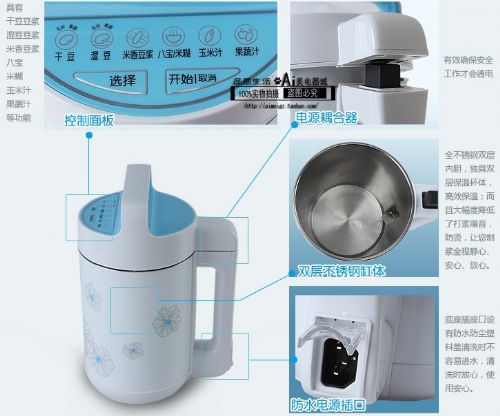 特点: ● 人性化设计,美观大方,操作方便; ● 微电脑控制,全自动制浆; ● 全新无网设计,豆浆更香浓..