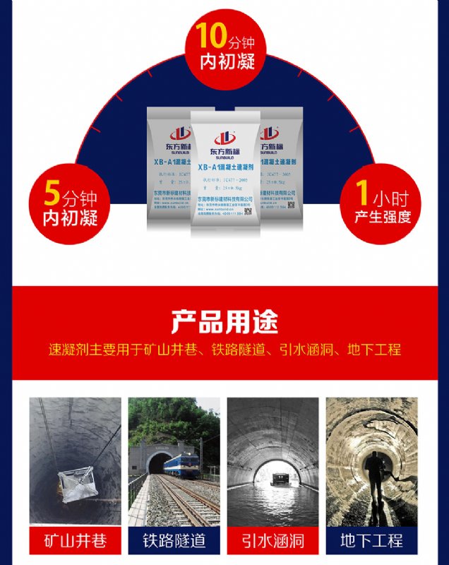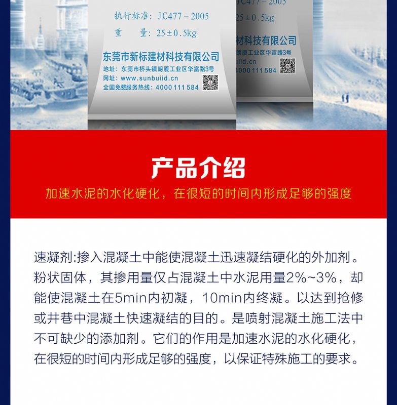 是以铝氧熟料为主要成份,经煅烧磨细而成。主要作用是调节砼凝结硬化速度,使用于喷射砼。由于速凝有它的重要特性,砼被喷射后在很短时间内即可凝结硬化,是一种加速水泥水化反应显著缩短凝结时间的调凝剂,在保持水泥砼各种性能情况下,其它性能可满足各种施工工艺要求。是一种抢修、抢建、防渗、堵漏锚喷等砼工程必不可缺少的化工支柱产品。