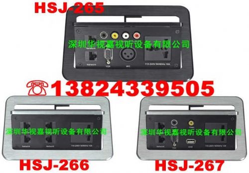 华视嘉牌多功能桌面信息插座专为计算机视音频、网络、电源、DVI、HDMI等多种接口连接器接插应用专业为各种高档会议、办公连接各种线缆而开发设计,产品高档、大方、实用性较强,“弹起式对接”“掀盖抽线”“电动翻转”“手动翻转”式结构解决方案。华视嘉牌多功能桌面信息插座能很容易地安装在几乎任何台面内。这种坚固可靠的接线面板结构非常紧凑,选用高品质接口,使用方便、传输效果好,成品线缆(例如VGA线缆、USB线缆、网络线缆等)采用定做线缆,保证质量,非成品线缆。使安装时间和工作量降到*低。接线面板安装好后可与台面保持齐平,用户按下接线面板的顶部,释放一个机械锁扣,接线面板迅速弹起各种音视频接口一目了然,并*终与台面成45度夹角,呈现出连接器插座。华视嘉牌多功能桌面信息插座产品是一种可以将电脑视频控制接口音频、视频连接口隐藏起来的建筑及家具辅助用品。并且安装方便。这种产品的完美设计使之几乎可以非常方便地安装到任何桌子的表面。且安装好之后,桌插将很好地闭合以保证桌面的平整,并且也隐藏了上述的控制接口和连接器。 - 深圳华视嘉视听设备有限公司