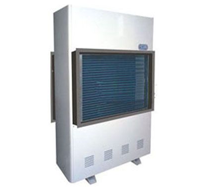 该机组功能齐全,有升温型、调温型、降温型三种功能,结构形式也多样化,有自带风机,安装比较方便,按进出风方式分:a.前进风、前出风,b.后进风、顶出风,c.前进风、顶出风三种型式,有不带风机,需另配风机箱,按面朝控制面板时机组的进风方向分左进风和右进风两种型式。