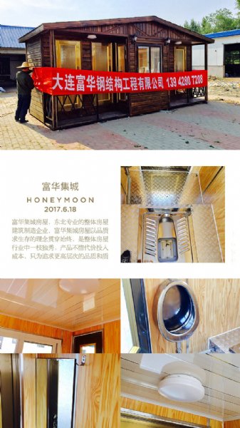 关于我们:来自国内的专业品牌:富华集城品牌属于大连富华恒润实业有限公司(原名:大连富华钢结构工程有限公司),富华集城品牌专业专注生产各式可移动式多功能房屋产品,目前产品涵盖范围包括(但不限于)整体房屋、轻钢别墅、别墅轻体房、环保厕所、微生物厕所、免水冲型移动厕所、泡沫封堵式生态厕所、多功能景区厕所、欧式保安亭、各式岗亭、值班室、垃圾房、生态房屋、整体房屋、欧式岗亭、轻钢房屋、别墅轻体房、景区小木屋、整体移动房、轻体房、保安亭、售货亭、生态别墅、木屋别墅、移动房、被动房、环保厕所、旅游区景观多功能房屋。环卫休息室、配电房、设备房、以及其他未定义的可定制型房屋产品。