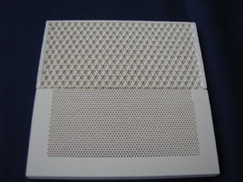 红外线陶瓷燃烧片,主要用于燃气式红外线燃烧器。此种陶瓷板通过将蜂窝陶瓷板表面由简单的平面式改进成波纹交错的立体型,增大比表面积和燃烧工作面积,从而起到更好的蓄热助燃作用,实现更完全的燃烧而没有火焰苗,达到红外线燃烧加热效果,从而实现低能耗及高环保的要求。克服了平面式在燃气燃烧时火焰过长,燃烧不够充分,导致能耗高,排放不够低的不足。主要用于家用燃具灶、多功能烧烤车、瓦斯红外线*烤炉