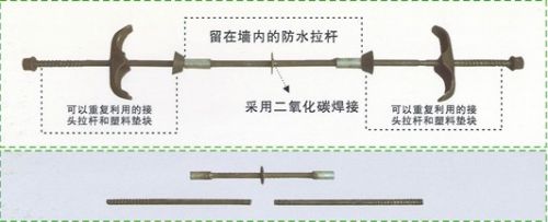 本新型止水螺杆分为三段:中间部分是止水螺杆,根据工程墙体的厚度定制生产螺杆的长度。两端螺杆通过螺丝与中间螺杆连接,两端的螺杆为带梯型扣的周转螺杆,可以轻松拆卸并周转使用。在使用时无论中间螺杆多长,都可以与之匹配使用。中间的防水螺杆部分采用CO2气体保护焊,无焊渣‘无焊缝,止水效果百分百。在施工过程中,两端的螺杆可以轻松装卸,不但省去了传统螺杆的气割工序,而且模板零损耗,而且节省30%模式板,同时能提高50%的工作效率。