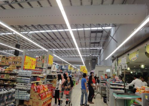 大型商场、超市一般没有天花吊顶。空调系统送风回风管道大多是裸露在空调受控区域内。传统材质风管美观度不高,且承重量大,而凌华纤维织物空气分布系统布风管系列织品布风管重量可以忽略不计(是传统风管的3%),还可以根据客户需求印制logo、宣传口号等。更为重要的是系统送风方式设计灵活,可在不同区域设计不同出风方式,以满足不同区域对风量冷量不同分布的要求,如:果蔬区域设计微渗透出风方式,可避免果蔬由于出风风速过大而流失水份的问题;在排队收银区域可设计喷孔出风方式或实现该区域大风量大冷量布风的要求。