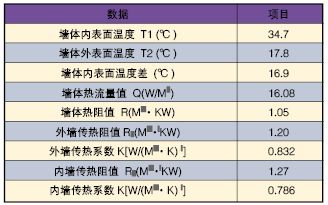 测试结果表明:混凝土保温模卡砌块墙体,三排孔,孔内插EPS 板交错三层(板厚30mm)水泥砂浆粉刷两面各15mm,总厚270mm。墙体热阻R=1.05 m2•K/W,作外墙时,传热系数K=0.832 W/(m2•K);作内墙时,传热系数K=0.786W/(m2•K)。