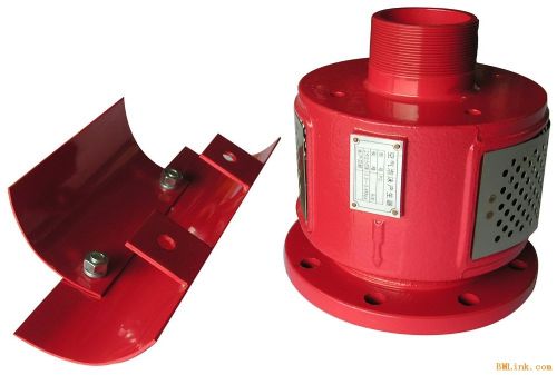 空气泡沫产生器由壳体、焊接法兰、连接法兰、导板及喷管组等五部分组成。该装置水平安装在油罐顶壁上,将比例混合装置产生的泡沫混合液与吸入的空气混合发泡产生泡沫,并将泡沫喷洒到燃烧液体表面,形成泡沫层、隔绝空气、吸收热量,从而把火扑灭。根据结构与形式可分为横式和立式两种,代号分别为PC和PCL。一般用于扑救A、B类火灾,主要用于扑救油类火灾。