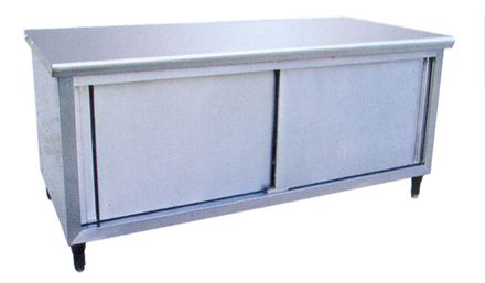板材选用优质不锈钢板材,台面采用1.5/1.2mm厚不锈钢板制作,柜身,层板,底板采用1.0mm厚不锈钢板,采用铝合金静音上轨道挂式吊门,门采用1.0mm厚不锈钢板,双层发泡拉门,台面、层板与底板用1.0mm厚*150mm宽不锈钢加强筋加固,脚通用1.2mm×直径38mm不锈钢园管连可调节脚。加脚杯装饰