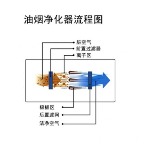 高碑店市馨云环保设备有限公司生产的油烟净化器净化流程油烟由风机吸入高压静电油烟净化器,当气流进入高压静电..