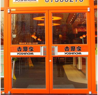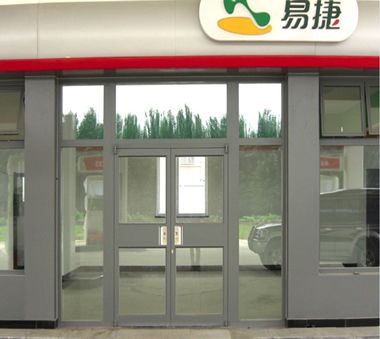 肯德基门主要由门框、门扇、门体玻璃、大拉手、大铰链、闭门器等组成。该门型均可安装于室内和室外。每樘门有两个门扇,左门扇、右门扇。门扇厚度40-60mm。 门扇一边的边框与门框之间由大铰链连接,门扇另一边门边框上安装有扳动式上下插销,门扇顶部横梁一侧安装有闭门器与门框连接。门体大铰链采用底部螺栓旋紧方式,美观大方,经久耐用。门扇中间部分可增加横撑,美观的同时也方便行人出入。门扇玻璃为钢化玻璃,门体安装不锈钢拉手,美观且方便行人出入。