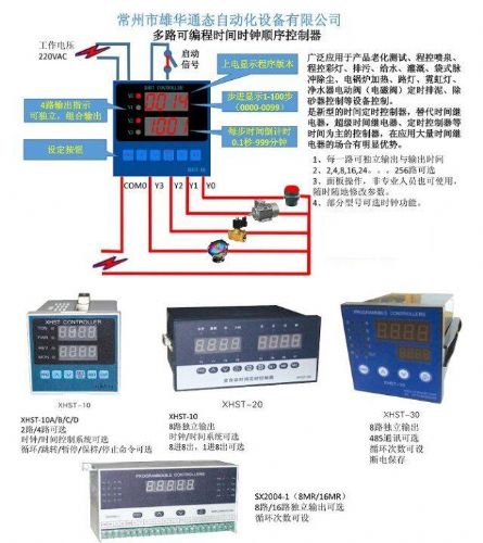 功能:计时器起动后,开始计时同时输出继电器动作,当计时到设定值时,停止计时同时输出继电器断开;计时起动方式:外接信号、外接开关、按钮、得电启动四种之一;面板有设置键、复位键及电源指示灯,时间顺序按照预先设置的顺序执行。也可以设置跳转和循环功能,循环次数可以0-9999次范围内任意设置,顺序控制的时间段有100段,对应的时间也有100段,每段时间对应的输出点可选组合。