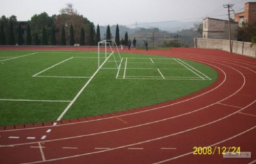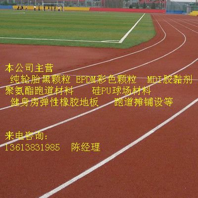 浆和EPDM颗粒混合体,喷涂于环保颗粒底层之上。透气型塑胶跑道材料包括:塑胶跑道胶水、单组份PU胶水、塑..