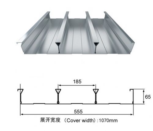 楼承板波峰高65mm,它由三个波组成,每个波距为185mm,有效覆盖面积555mm,它采用的是1000mm的冷轧热镀锌钢板冷压成型的,使用率53%适中,承载力较强,由于它是采用了全闭口型的设计其防火性能也要优于一般楼承板,