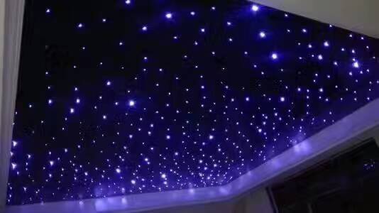我司采用环保吸音板(颜色多样可选择)来做满天星,*一好处实惠价格,地二安装简单,第三运费便宜。第四环保,安全,阻燃。第五效果好看,客户可选择自己喜欢的效果做各种形状的效果光纤灯。