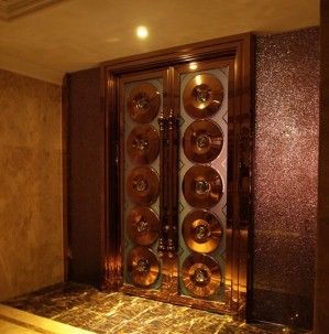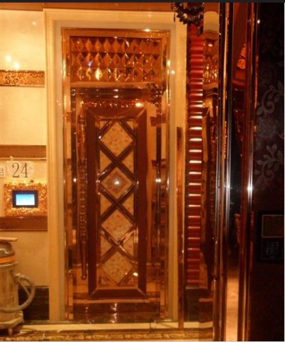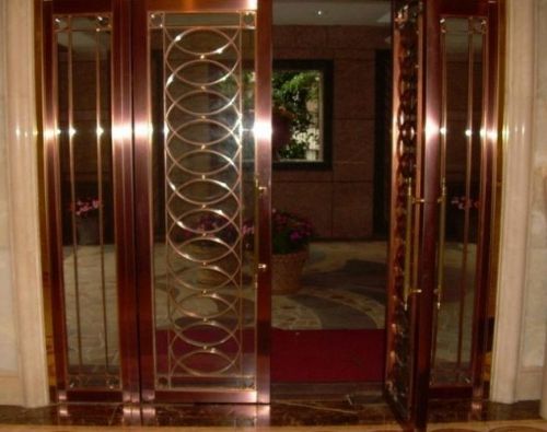 玫瑰金拉丝不锈钢KTV大门是利用304#201#不锈钢板为基材,对其表面进行镜面,拉丝,蚀刻,焊接,抛光..