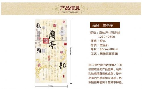 设计理念:兰亭兴集,思逸神超。兰亭序是家家户户书房理想中的瓷砖背景墙,营造出深究学问的氛围。至今兰亭序深受读者所爱,其原因是美学意义,“风神萧洒,意态悠闲,不偏不激,中正平和”。