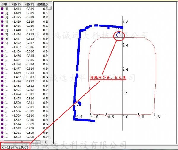 在检测过程中,系统自动进行实时全断面扫描,同时在软件界面显示隧道断面的线轮廓及尺寸数据。自动将扫描结果与预先保存在数据库内的标准限界数据(包含曲线加宽数据)进行比较,如果有设备侵入限界,声光报警并标注超限位置坐标、提供超限等级、超限数值等,并将超限点记录在数据库中方便查看,同时检测的结果予以保存,具备复查、全线回放和定点回放、数据检索和查询、多选型打印等功能。该系统完全代替现有的手工限界检测方式,智能化、自动化程度高,可扩充性好,测量精度高,极大的提高了现场检测效率。而且设备结构简单,模块化设计,方便后期维护。