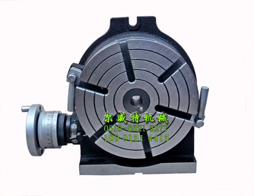 是铣床的主要附件之一,可用在铣床上进行分 度钻孔或铣削、圆周切削、镗孔、锪平面等工作。工作台有360° 刻线,并有刻度值为1′的刻度杯和*小分辨值为10的游标杯。 回转工作台具有刹紧和分度蜗杆脱落机构。 与尾座(特殊订货)配合使用,可对较复杂的工件进行圆周分度钻 削和铣削