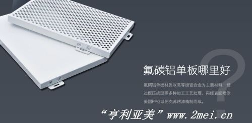 材质以高等级铝合金为主要材料,经过模压成型等多种加工工艺处理,再经表面喷涂美国PPG或阿克苏烤漆精制而成。幕墙氟碳铝单板主要由面板、加强筋骨,挂耳等组成;其常用厚度为:2.0mm、2.5mm、3.0mm。氟碳铝单板幕墙系统表面平整光滑,耐风压性能好,有多种颜色涂层可供选择,让建筑传递出一种与众不同的现代感。系统设计合理,可满足多种功能需要,广泛应用于各种商业或工业建筑的墙体装饰。