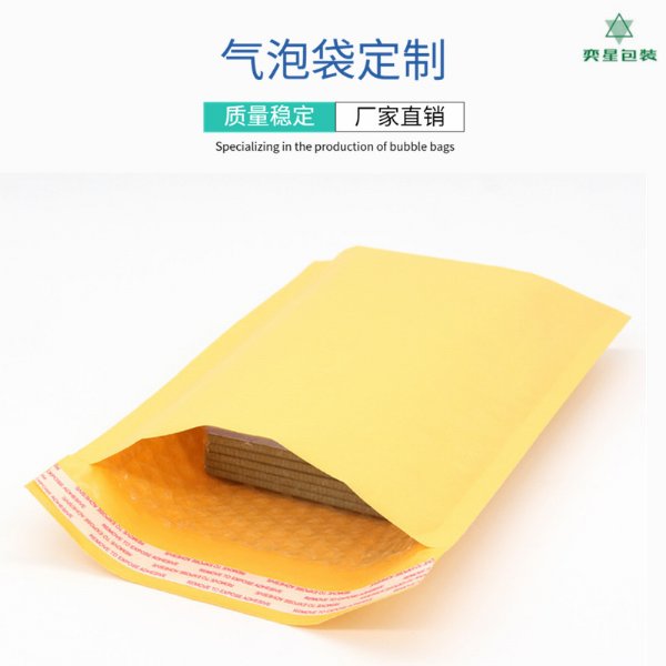 该产品具有两层结构,有体积轻又环保的优点。外层为牛皮纸,内衬气泡。袋子美观大方,表面易书写,其独特的韧性可防止袋子破裂;内层透明气泡具备良好的缓冲作用,防止所装物品因压,碰,跌落而损坏…。