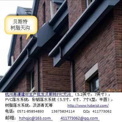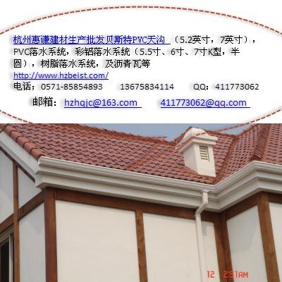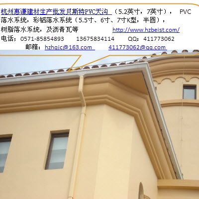 主营业务:优质PVC天沟,PVC落水系统,金属落水系统,彩铝落水系统,雨水管,排水管道,落水管,多彩玻纤瓦,沥青瓦