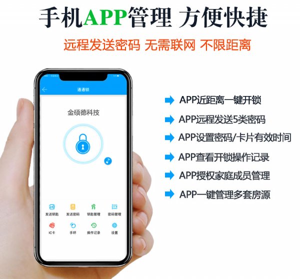 金硕德公寓智能锁主要采用APP密码+刷卡感应开门,所以又称为公寓密码锁,之所以需要APP,重要的功能就是可以远程实现控制管理公寓门锁,对于公寓,出租屋或民宿出租经营的管理者来说,APP密码可以方便他们管理作业,只要通过APP发送密码给租客,便能实现自助入住,同时,由于密码可以设置时效性,管理者可以方便管理租客的入住时间,对于避免租客拖欠租金等各种情况。